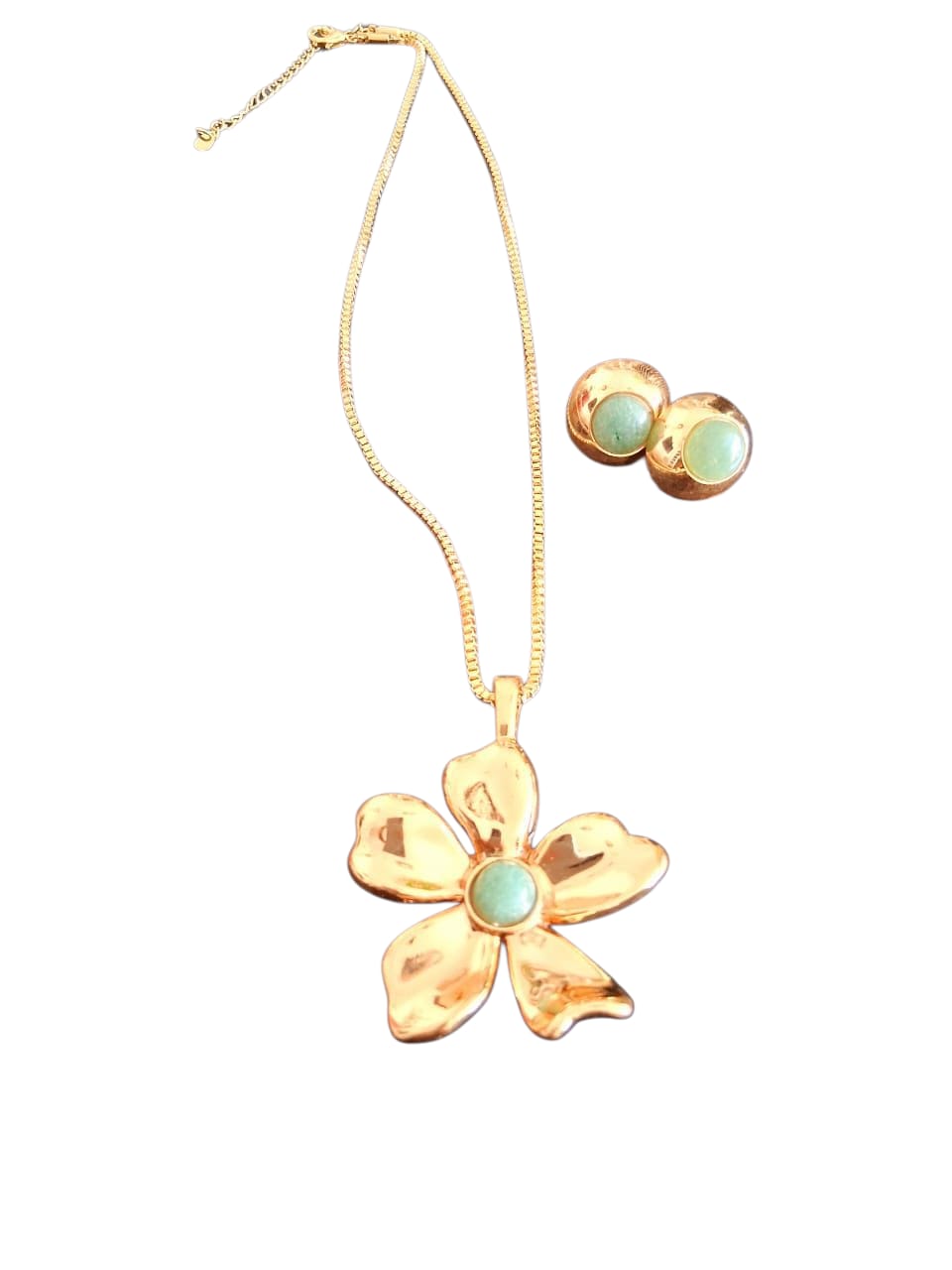 Conjunto com colar e brincos banhados a ouro 18k e pedra verde natural. A flor simboliza delicadeza e a pedra atrai equilíbrio, serenidade e energias positivas. Um toque de elegância e boas vibrações da coleção Anaara’s.